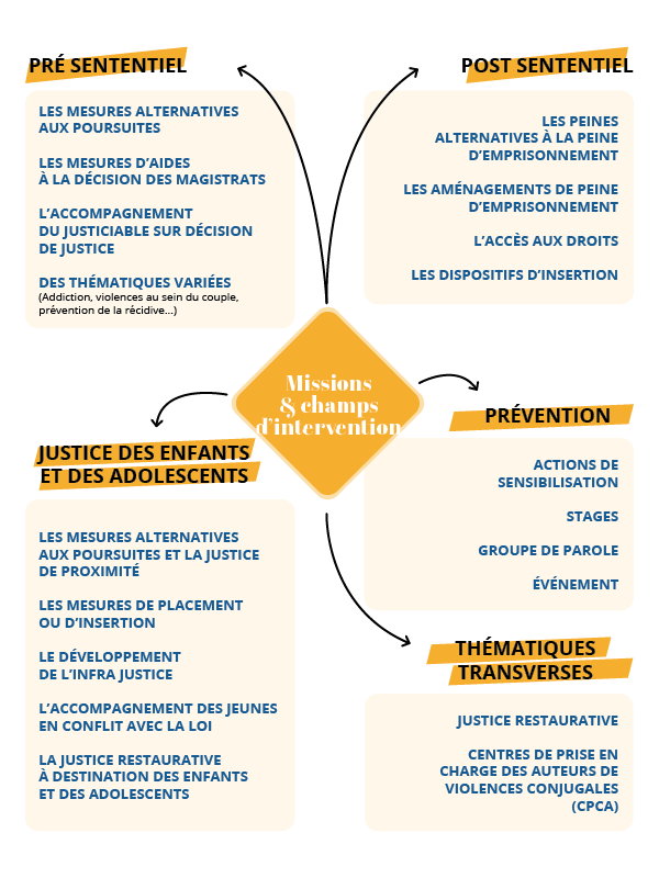 Les associations socio-judiciaires effectuent des missions d’enquête, d’accompagnement, de responsabilisation, de réinsertion et des mesures éducatives dans le cadre des :